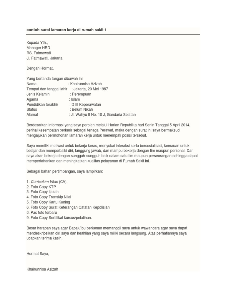 Download Contoh Surat Lamaran Kerja Rumah Sakit Siloam Berbagi from contohsuratlengkap.org Contoh surat lamaran pekerjaan untuk beberapa sumber informasi lowongan, diambil dari sumber di internet dan dilakukan modifikasi, semoga bermanfaatfull description. Jika diminta surat lamaran kerja dalam bentuk tulis tangan saat melamar pekerjaan di rumah sakit, contoh ini bisa menjadi rujukan anda. Direktur rumah sakit tamma jl. Adapun, biodata singkat saya sebagai berikut Contoh surat lamaran kerja rumah sakit siloam & sardjito. Contoh surat lamaran kerja yang baik dan benar memang diperlukan sesuai eyd ada banyak jenis format lamaran kerja mulai dari surat lamaran surat keterangan. Format struktur surat lamaran kerja diatas dapat anda gunakan untuk melamar pekerjaan di rumah sakit mana saja. Bersama dengan surat lamaran pekerjaan yang telah saya buat ini, saya mengajukan diri agar bisa bergabung di perusahaan bapak / ibu pimpin.