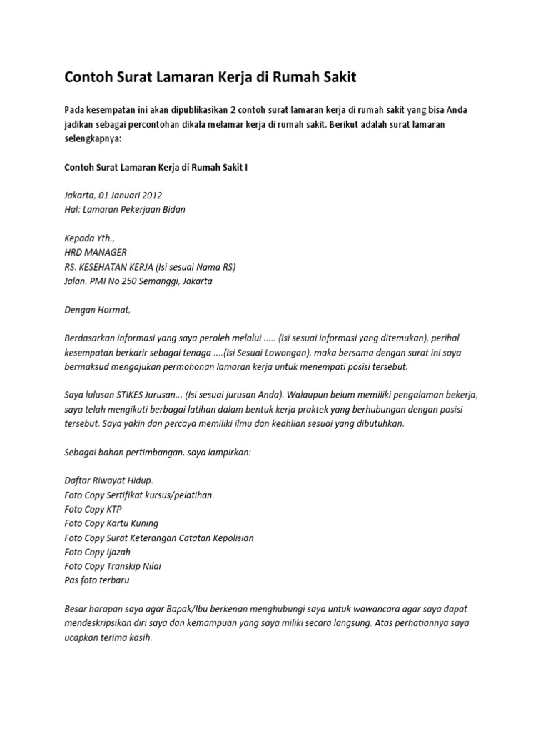 Contoh surat lamaran pekerjaan untuk beberapa sumber informasi lowongan, diambil dari sumber di internet dan dilakukan modifikasi, semoga bermanfaatfull description. Kalau belum tahu, ada beberapa rumah sakit besar di jakarta tersebut masih buka lowongan hingga september mendatang. Contoh surat lamaran kerja di rumah sakit 1. Bagi kamu yang bingung bikin surat lamaran pekerjaan perawat. Contoh surat lamaran kerja di rumah sakit adalah merupakan postingan yang akan saya bahas pada kesempatan yang berbahagia ini untuk kamu para pengunjung setia semuanya, khususnya bagi kamu yang ingin melamar pekerjaan di rumah sakit. Setelah lulus, alangkah baiknya anda segera mencari pekerjaan sebagai dokter. Besar harapan saya untuk dapat diterima dan diberikan kesempatan menunjukkan kemampuan saya dalam menjadi perawat di rumah sakit yang. Namun, tidak sedikit yang tidak memberikan. Direktur rumah sakit tamma jl. Berikut ini adalah contoh surat lamaran kerja di rumah sakit. Pada artikel sebelumnya kita telah membahas secara panjang dan lebar mengenai surat lamaran kerja, di mana ada beberapa berkas yang harus kita sertakan … Kepala rumah sakit siloam depok. Demikian surat lamaran pekerjaan untuk menjadi perawat ini saya ajukan.